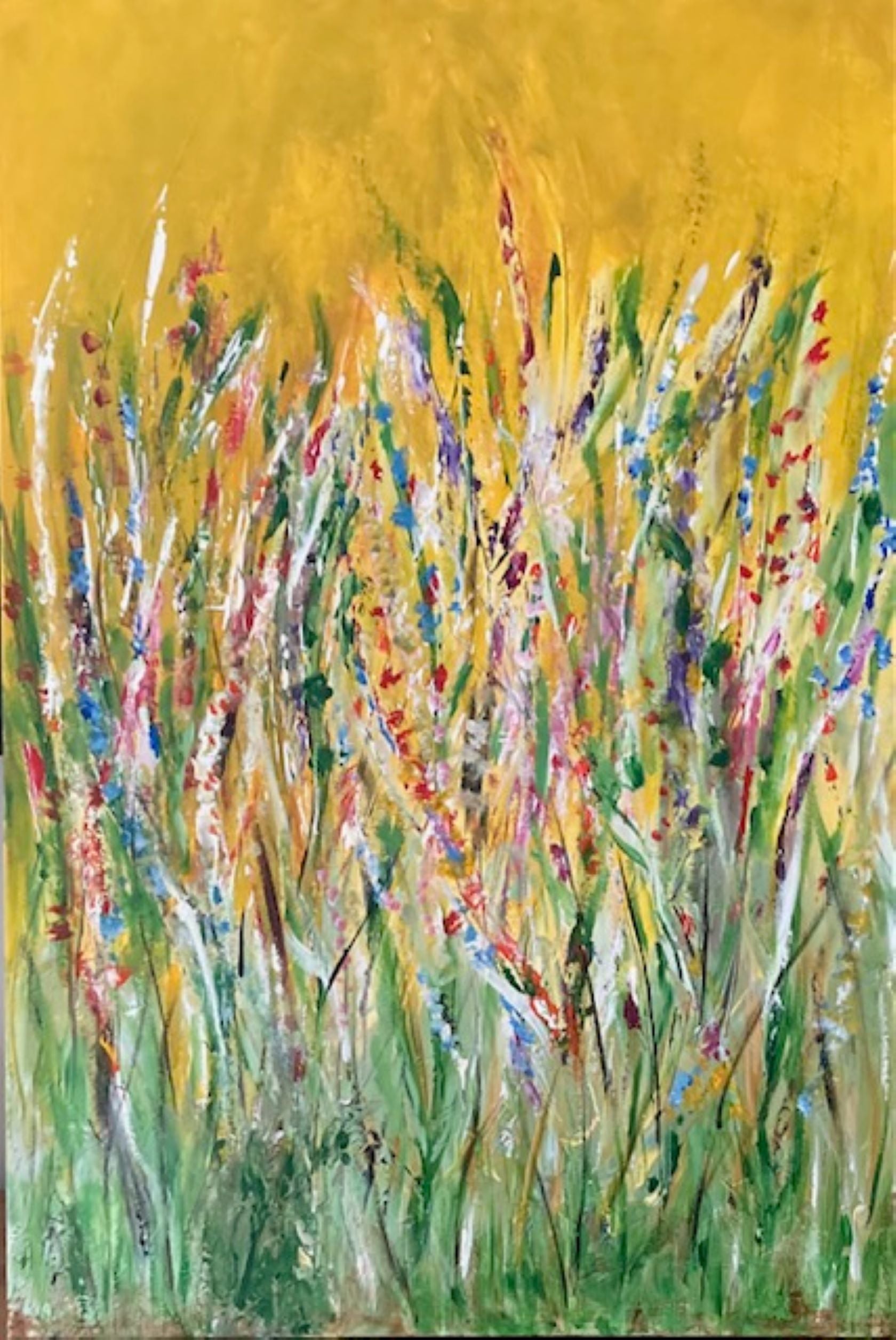 A vibrant 24" × 36" original acrylic painting bursting with joyful energy and color. Cheerful yellows and fresh greens create a luminous background for wildflowers that dance across the canvas, celebrating nature's exuberant beauty with a happy, uplifting palette.