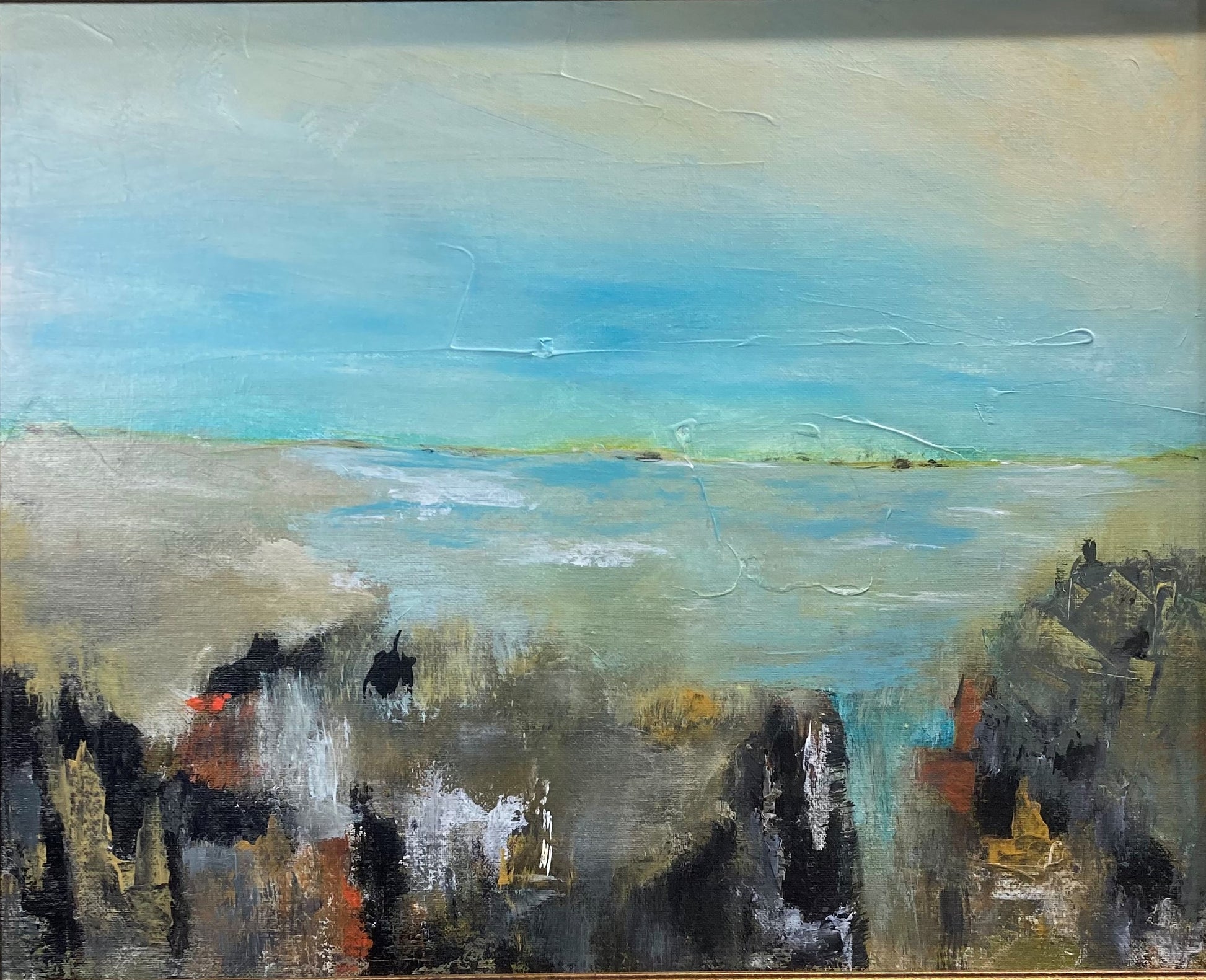 Tributary explores the meeting point of water and shore through impressionistic brushwork and a contemplative coastal palette. Deep blues and blacks anchor the composition while hints of coastal colors suggest the ever-changing interplay of light, water, and land. This intimate piece brings the serene energy of the shoreline into any space.